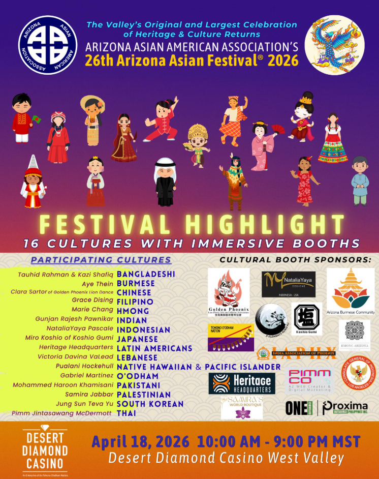 26th Arizona Asian Festival 2026 Saturday, April 18, 2026 10:00 AM 9:00 PM 10:00 21:00 West USA Realty 1850 East Northrop Boulevard #170 Chandler, AZ, 85286 United States (map) Google Calendar ICS